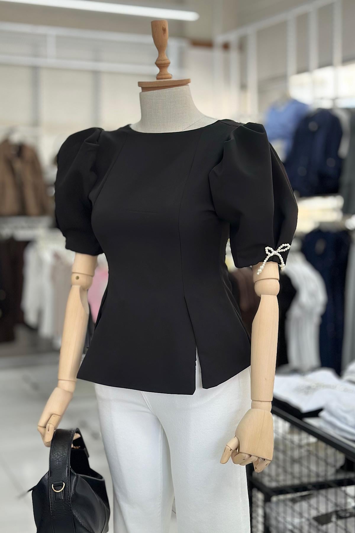 FİYONK İNCİLİ BALON KOL BLUZ-Siyah