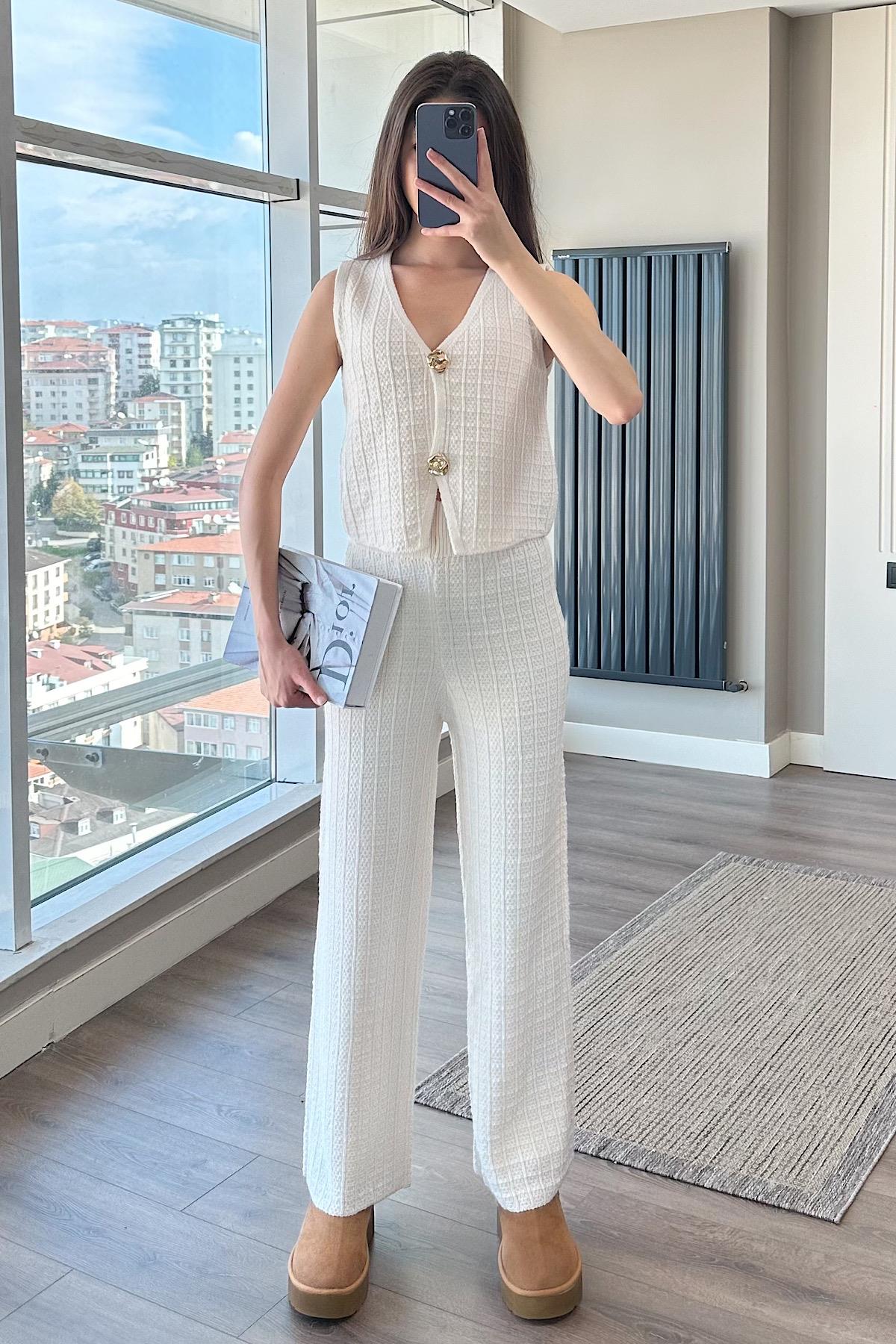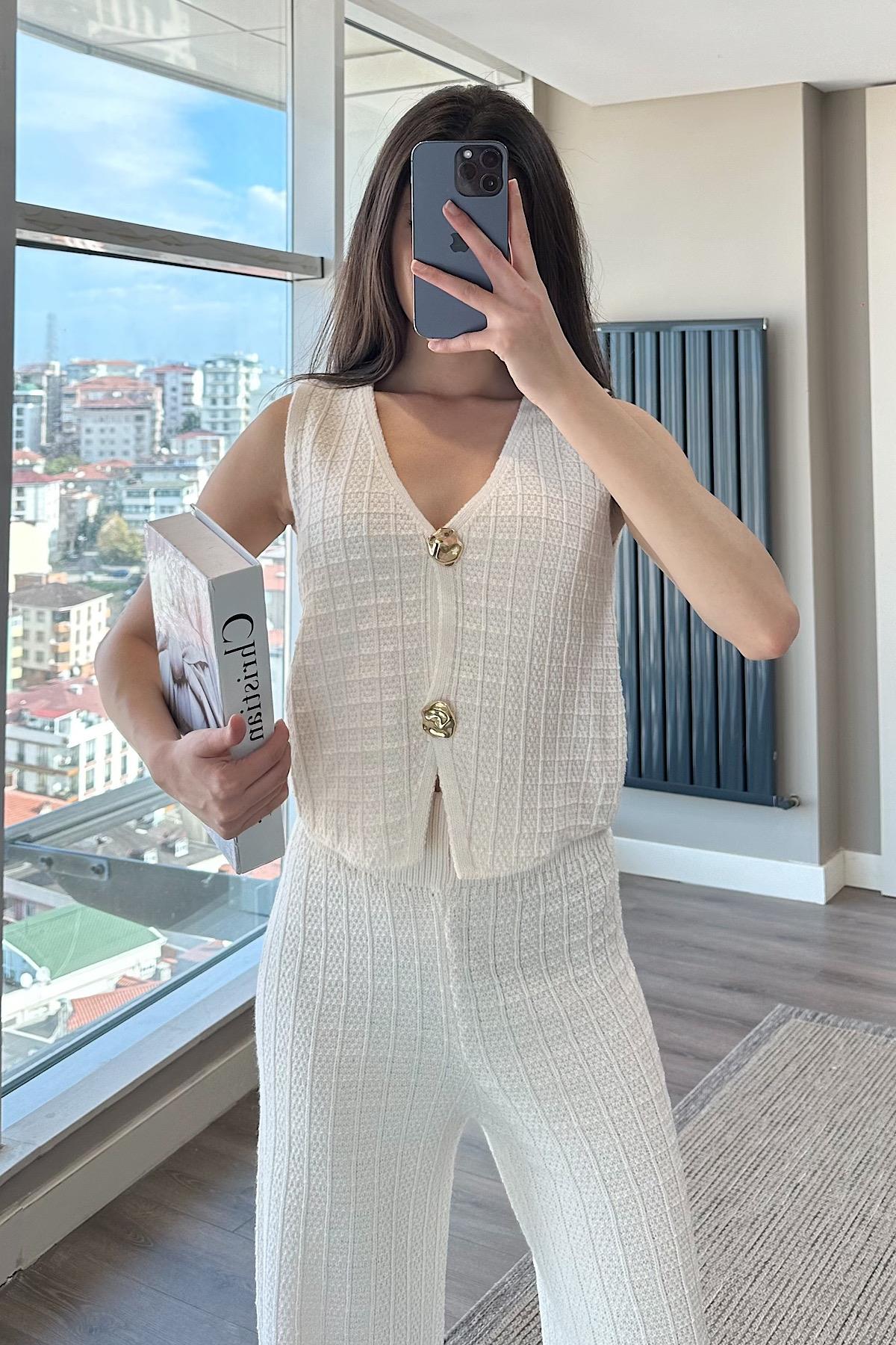 GOLD DÜĞMELİ YELEK TAKIM-krem