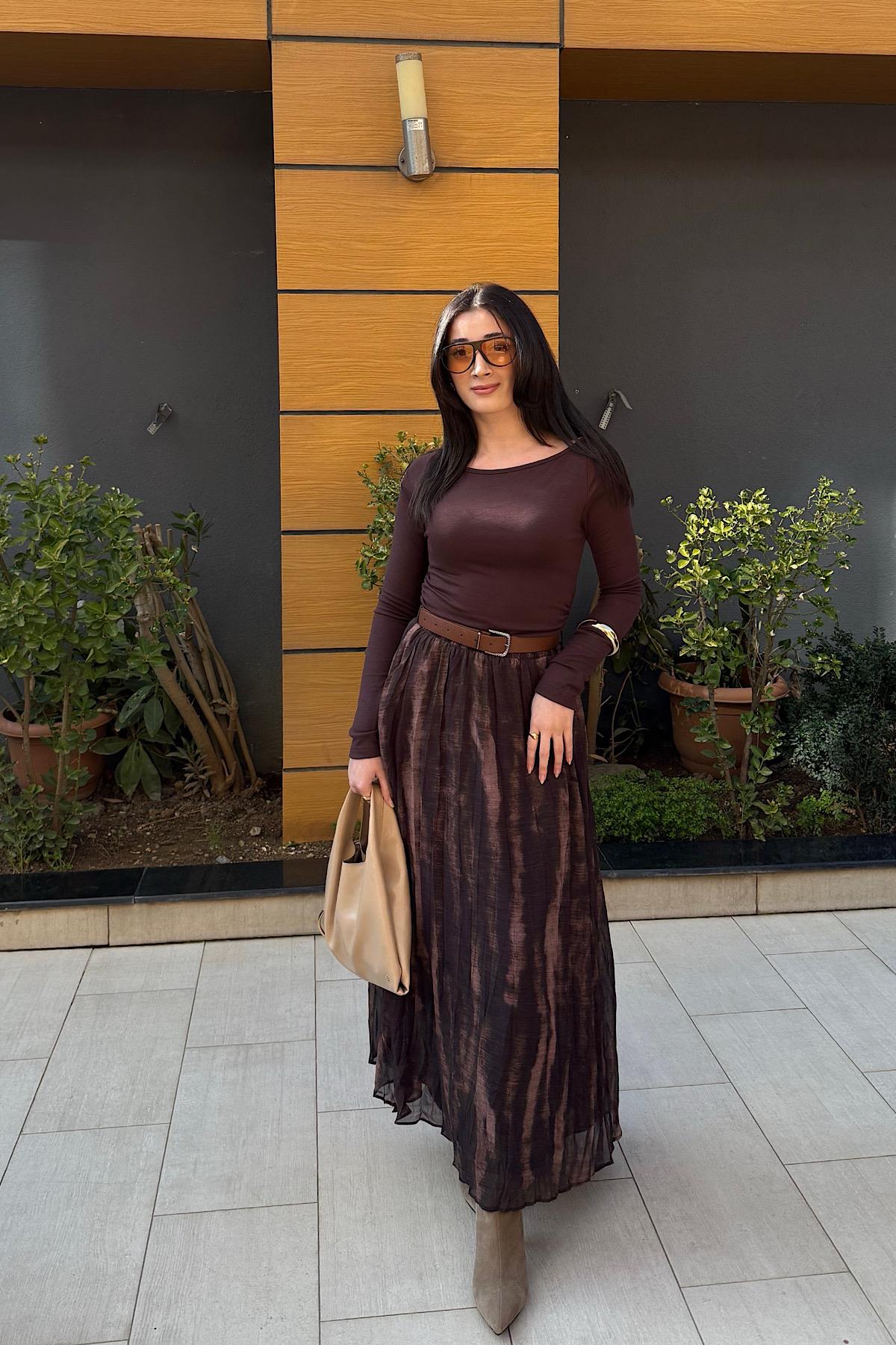 KEMERLİ DESENLİ ŞİFON ETEK-Kahve