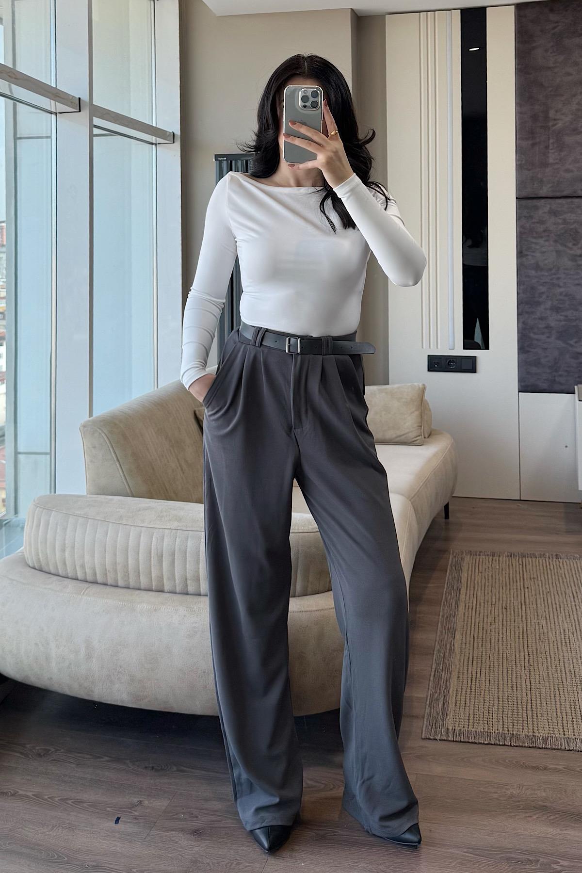 KEMERLİ PALAZZO PANTOLON-Gri