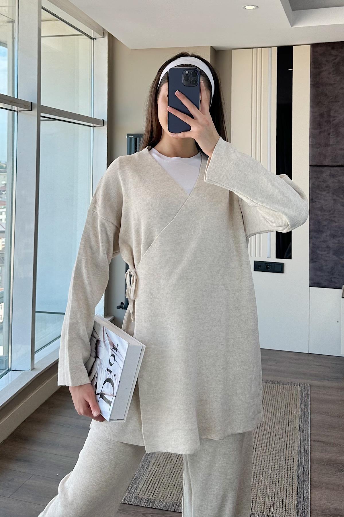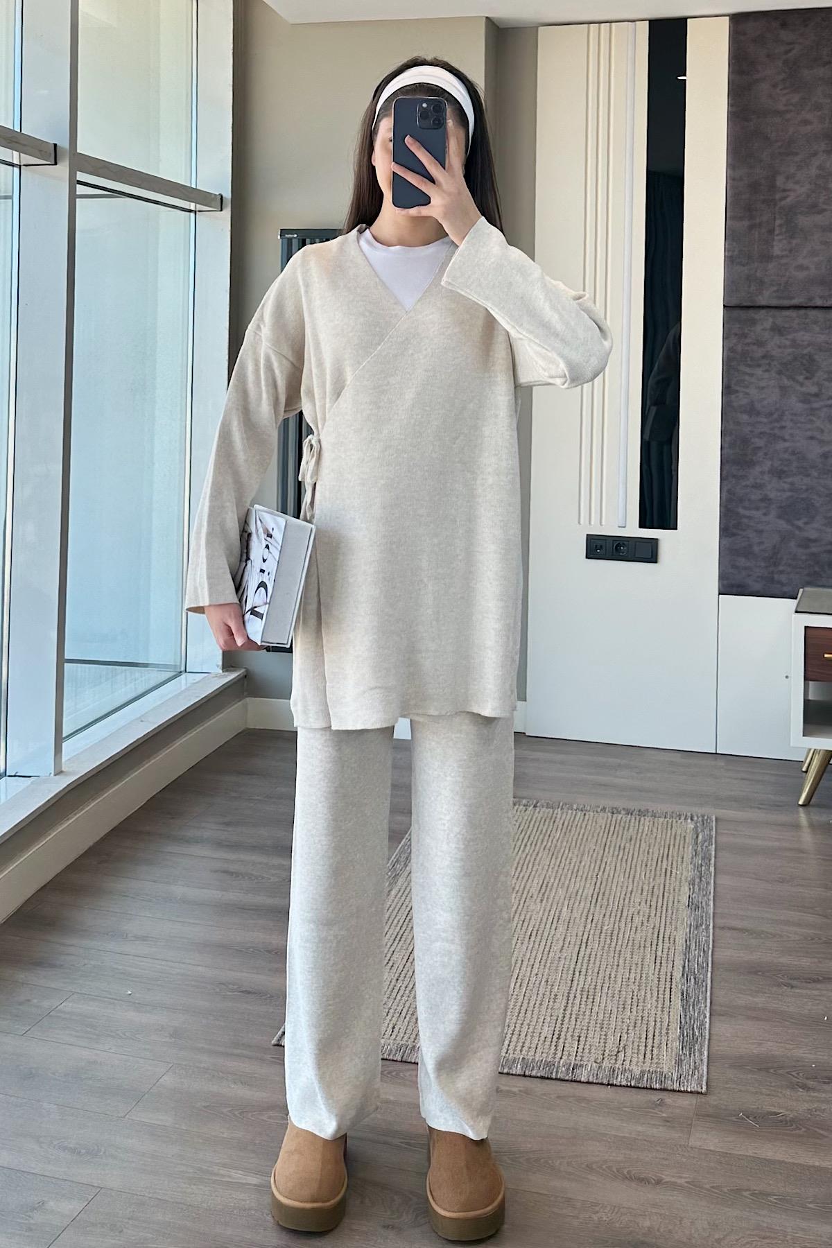 MİREL BAĞLAMALI TRİKO TAKIM-Ekru